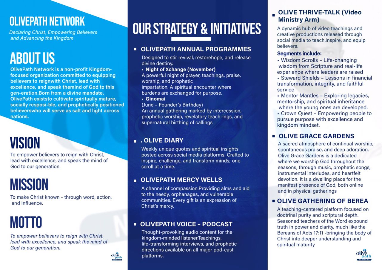 Olive Path Network is a non-profit Kingdom-focused organization committed to equipping believers to reign with Christ, lead with excellence, and speak the mind of God to this generation. Born from a divine mandate, OlivePath exists to cultivate spiritually mature, socially responsible, and prophetically positioned believers who will serve as salt and light across nations.